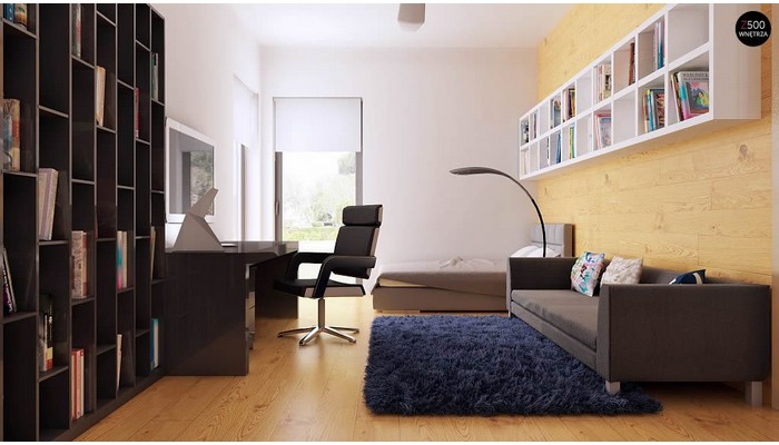 To funkcjonalny dom parterowy dla czteroosobowej rodziny. Dwa wykusze, w kuchni i w jadalni urozmaicają prostą konstrukcje domu z dwuspadowym dachem. Drewniana okładzina elewacji wraz z szarymi oknami nadają domu nowoczesnego i eleganckiego charakteru, który zwraca uwagę. Część sypialniana domu została wydzielona w lewym skrzydle i składa się z 3 sypialni, z których jedna wyposażona jest w garderobę oraz łazienki. Prawe skrzydło domu stanowi część dzienną, w której mieści się salon, kuchnia i pomieszczenie gospodarcze. Dom odznacza bardzo ciekawe rozwiązanie powierzchni użytkowej i komunikacji, która umożliwia dostanie się do kuchni prosto z przedpokoju, omijając salon.