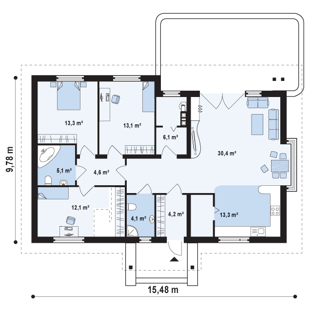 Jest to projekt domu parterowego odznaczający się bardzo eleganckim i nowoczesnym wyglądem, oraz przestronnym i komfortowym wnętrzem. Pierwotnie projekt przewidziany jest jako parterowy, ale wysoki, czterospadowy dach umożliwia adaptację poddasza niskim kosztem i uzyskanie dodatkowo około 80 m2 powierzchni użytkowej . Duży salon i 3 pokoje na parterze wystarczą, aby z pomieścić 4-5 osobową rodzinę, a zaadaptowane poddasze z powodzeniem może służyć jako część mieszkalna dla dodatkowych 3-4 osób. Duży salon i kuchnia ze spiżarką czynią część dzienną komfortowym miejscem do spędzania czasu. Projekt przewiduje dwie łazienki, z których jedna może być również wykorzystana na pralnie. Projekt jest już dostępny w wersji drewnianej.